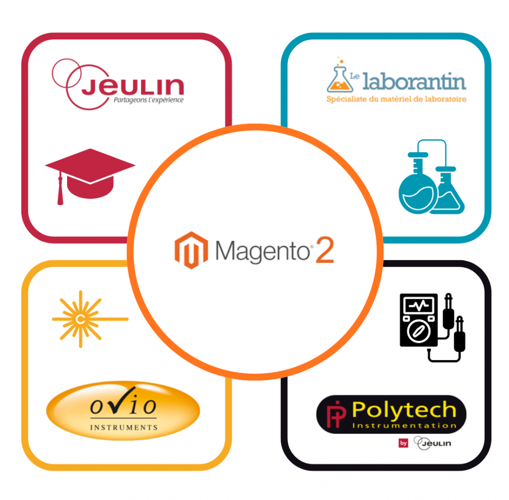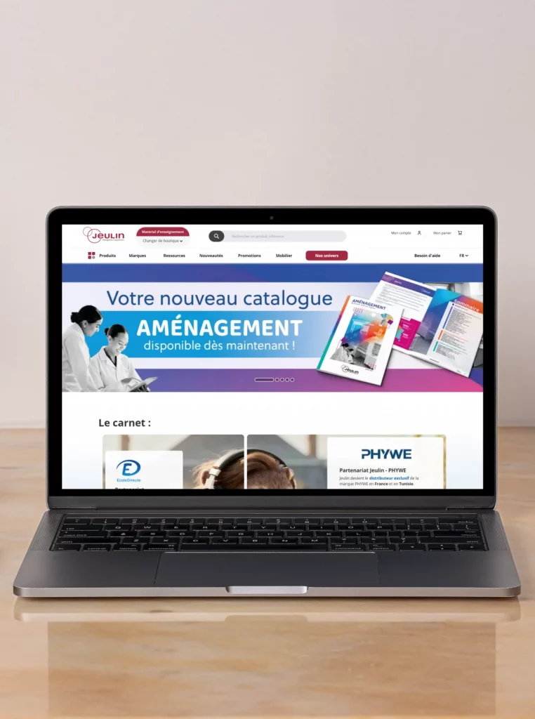 L’un des enjeux majeurs de la refonte était de regrouper plusieurs boutiques en ligne au sein d’un site unique, à la manière d’une galerie marchande digitale. Cela permettait de réunir différentes marques du groupe avec chacune son univers : Jeulin pour le matériel pédagogique, Le Laborantin pour les équipements de laboratoire, Polytech pour les instruments de mesure et Ovio pour le matériel optique. Cette organisation devait offrir une navigation claire et intuitive pour les utilisateurs tout en simplifiant la gestion des contenus pour l’entreprise.